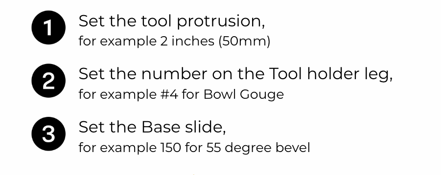Core to the Tru-Grind design is the unique ability to simply set the jig to a number, with accurate repeatability, the versatility of a single jig to hold any woodturning tool without the need of an adaptor and the compact design of the system.
